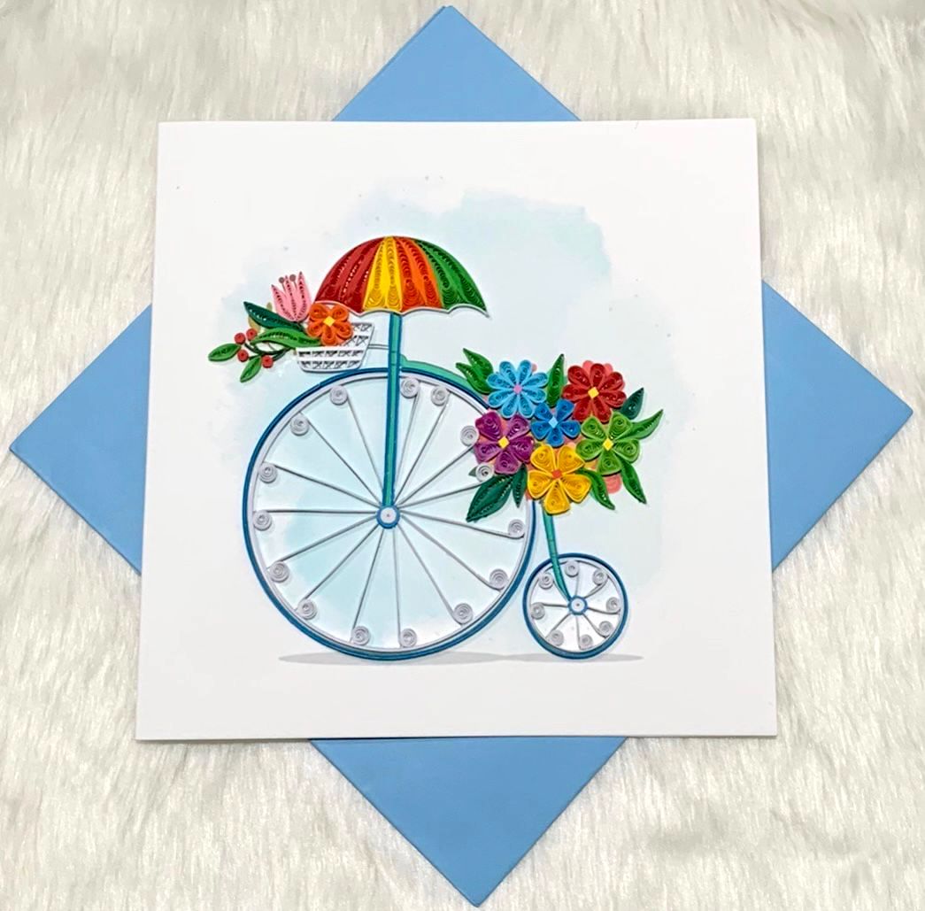 Über diese wunderschöne handgefertigte Karte, passend für viele Anlässe freut sich sicher jeder. Das bunt geschmückte Hochrad ist ein echter Hingucker.
