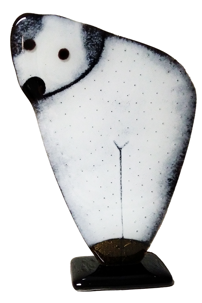 Wunderschöne Glasfigur Polarbär aus Fusingglas aus dem Glas Studio Habrat Farbe:weiß/schwarz, über dem Sockel mit Blattgold verziert. H:17 cm Lieferung in ansprechender Geschenkverpackung